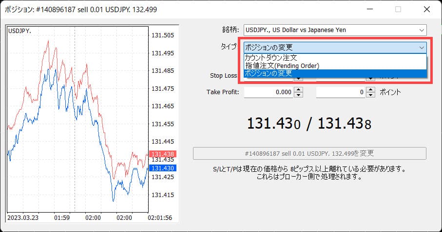 MT4の場合は注文種別の箇所にある「両建て解除:通貨ペアを指定」を選択すれば、両建てを同時に解除することができます。