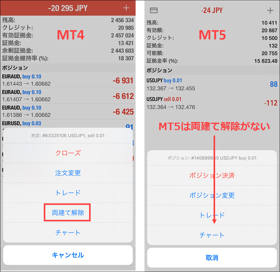 MT4アプリでは両建て解除が可能ですが、MT5アプリではその機能がなくなっています。