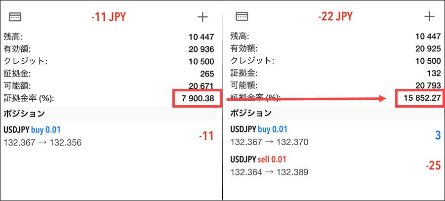 - 両建てをすると証拠金維持率は0ではないですが、スプレッドの差のみ証拠金がかかります。