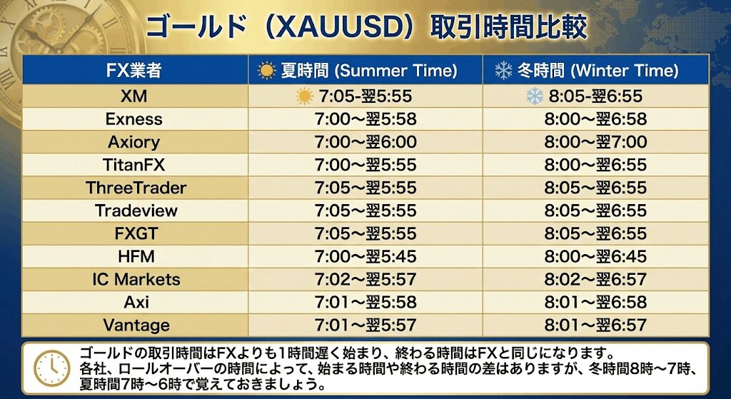 ゴールドの取引時間はFXよりも1時間遅く始まり、終わる時間はFXと同じになります。