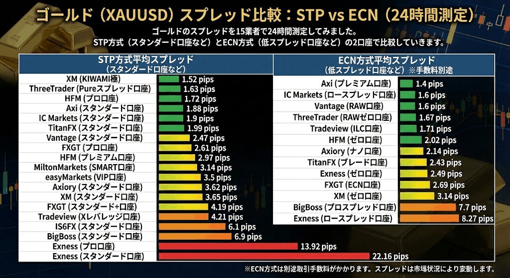 FXGTはプロ口座のスプレッドが狭く、ECN口座もプロ口座とあまり変わらない結果となっています。