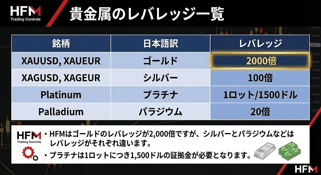 HFMはゴールドのレバレッジが2,000倍ですが、シルバーとパラジウムなどはレバレッジがそれぞれ違います。