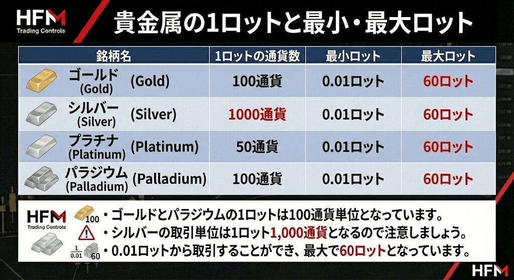 ゴールドとパラジウムの1ロットは100通貨単位となっています。シルバーの取引単位は1ロット1,000通貨となるので注意しましょう。