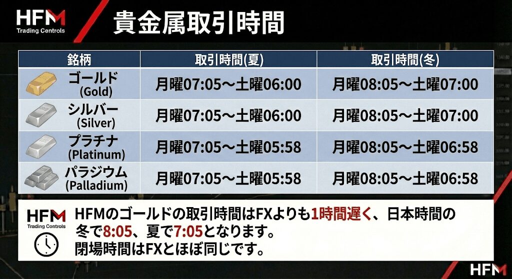 HFMのゴールドの取引時間はFXよりも1時間遅く、日本時間の冬で8:05、夏で7:05となります。