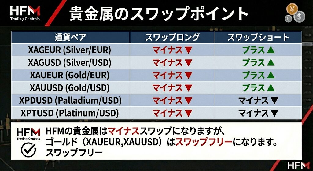 HFMの貴金属はマイナススワップになりますが、ゴールドはスワップフリーになります。
