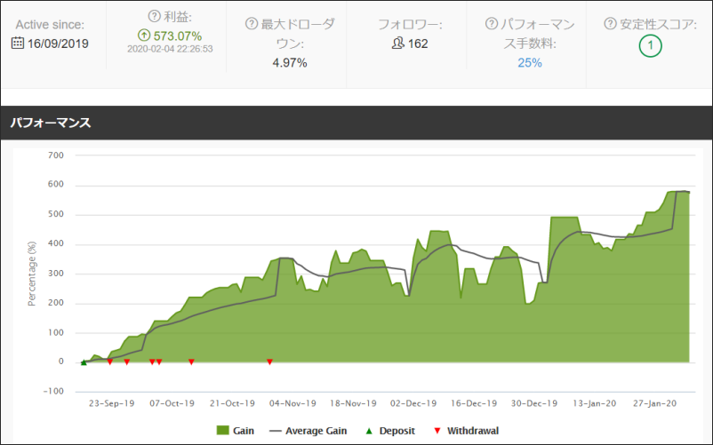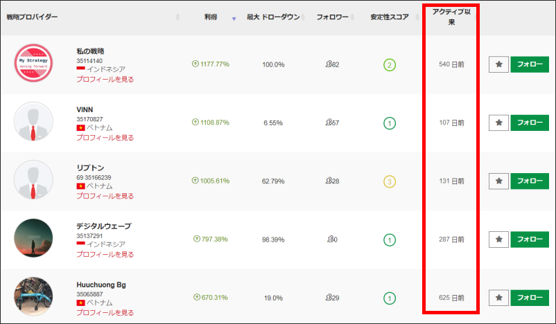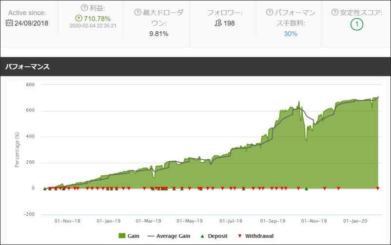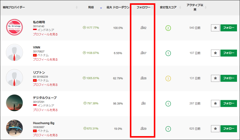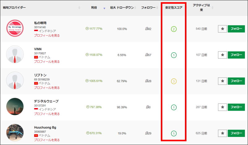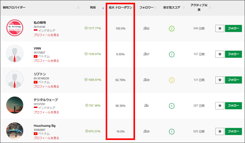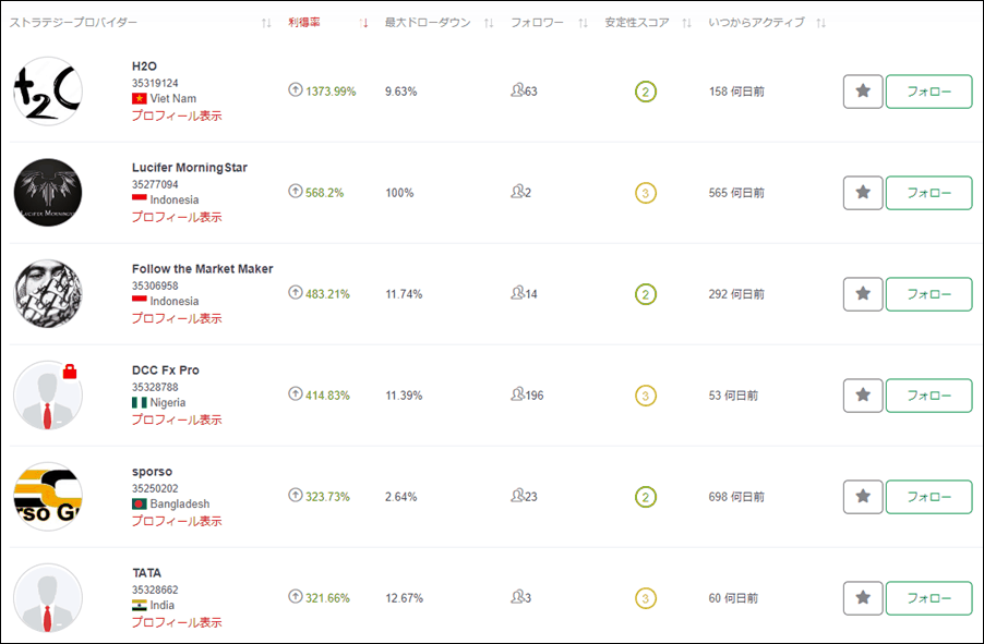 - ドローダウンが低く、長期間安定的に利益を上げ続けている人を選びましょう。