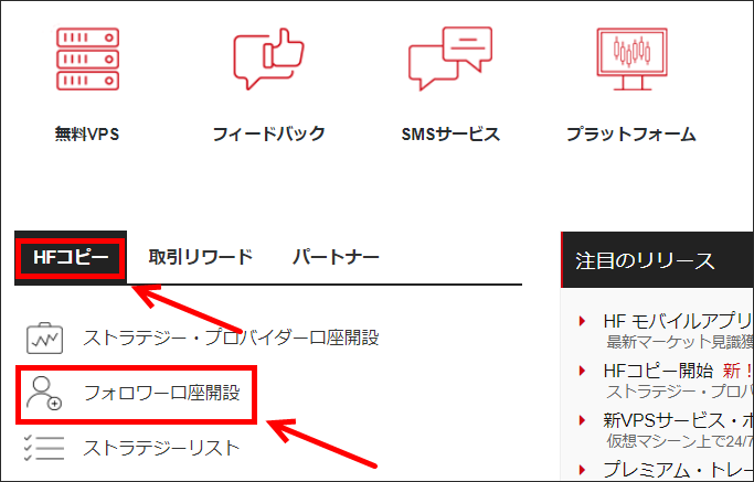 HFMのマイページ(myHF)の左下にある「HFコピー」→「フォロワー口座開設」をクリックします。