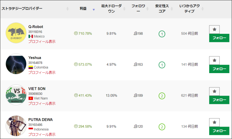 私が検索した時は「Q-Robot」という人が一番利益を上げているようですね。