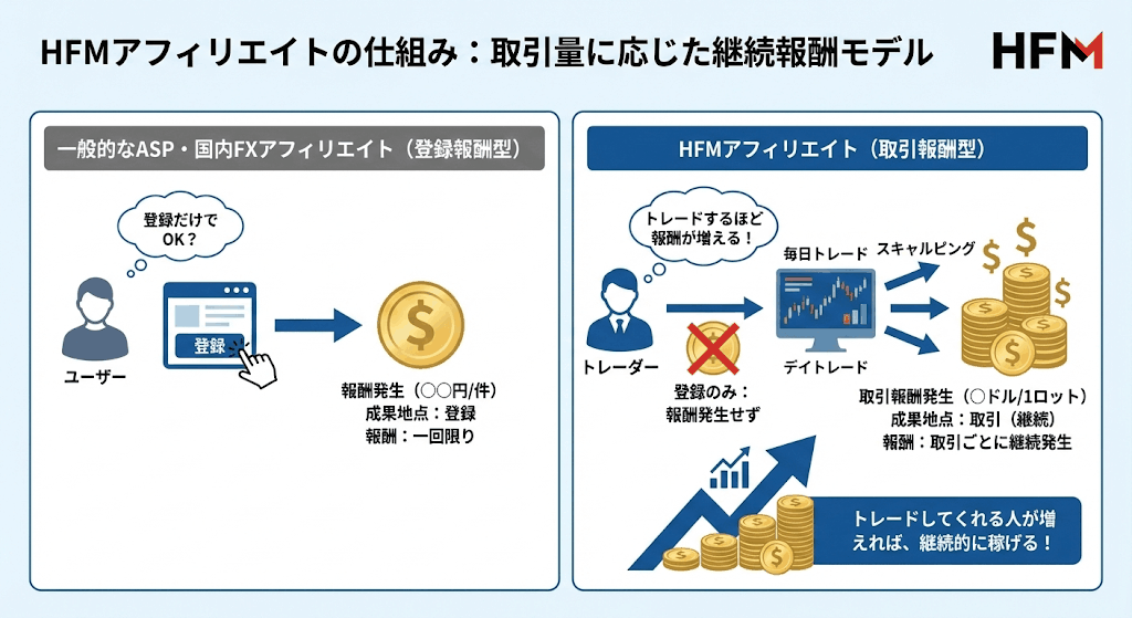 通常のASPアフィリエイトや、国内FXの場合は「登録でいくら」という仕組みが多いですが、HFMの場合は登録だけでは報酬は発生せず、その後のトレードが必要になります。