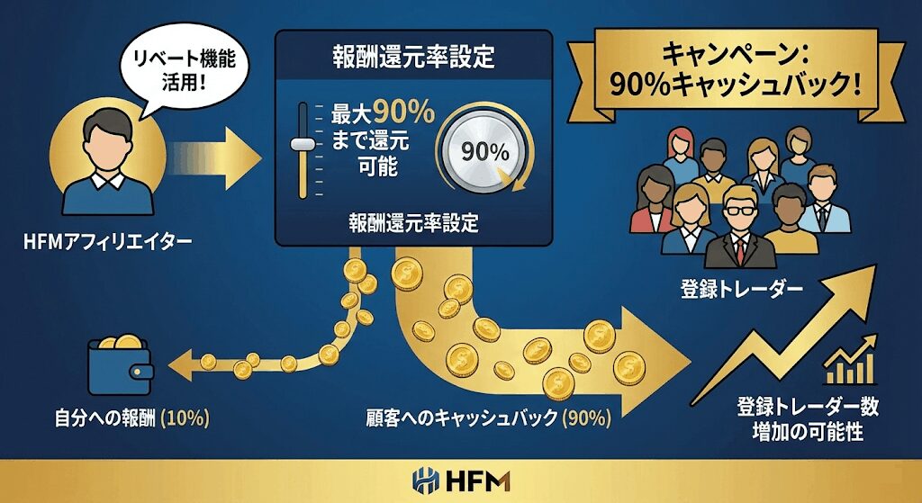 HFMのアフィリエイトは登録してくれたトレーダーのキャッシュバックをする「リベート機能」があり、報酬の最大90%までキャッシュバックすることが可能です。