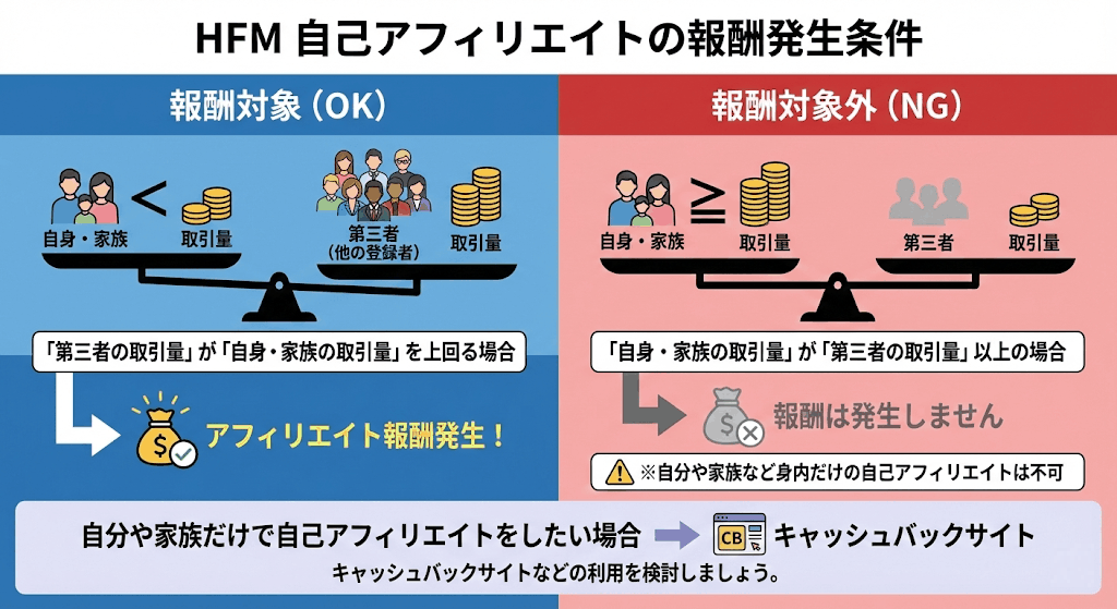 HFMでは「自身やご家族以外の取引量」が「自身やご家族の取引量を上回る場合」にアフィリエイト報酬を受け取ることが可能です。