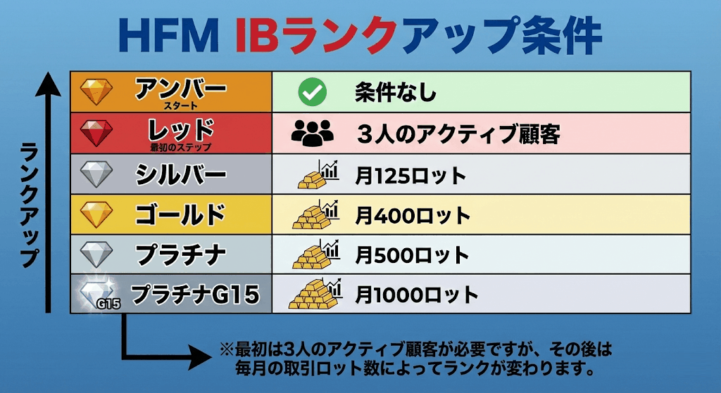HFMのIBランクアップには、最初は3人のアクティブ顧客が必要ですが、その後は毎月の取引ロット数によって変わります。