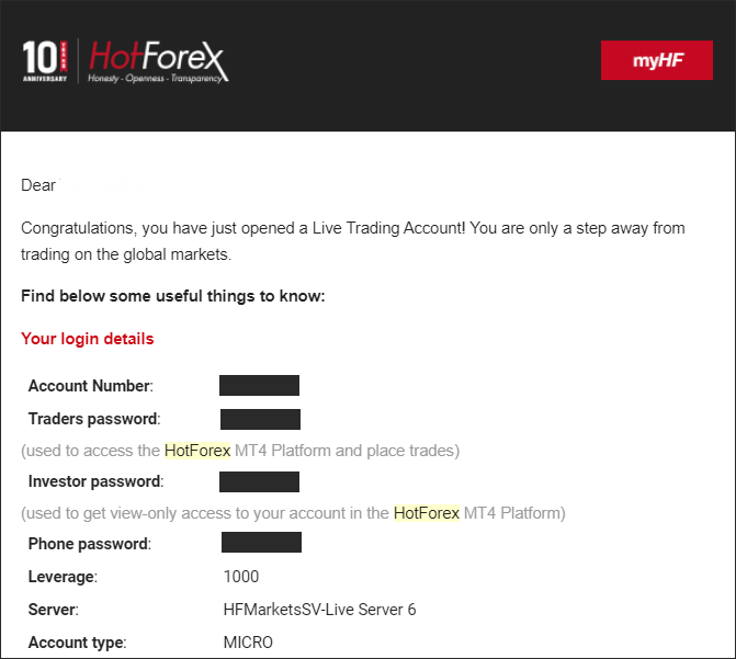 ログイン情報が分からない場合は、口座を作った時に来るメール「HFM Live Account Opened」(もしくはHotforex Live Account Opened)に3つの情報が書かれていますので確認しましょう。