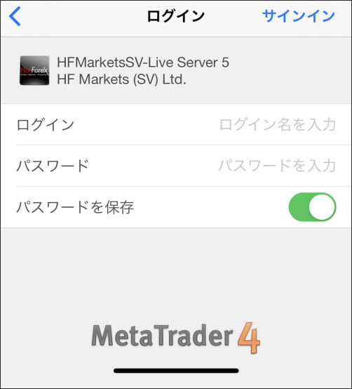 ログインIDとパスワードを入力し「サインイン」をクリックしたらHFMのiPhoneMT4へのログインは完了です。