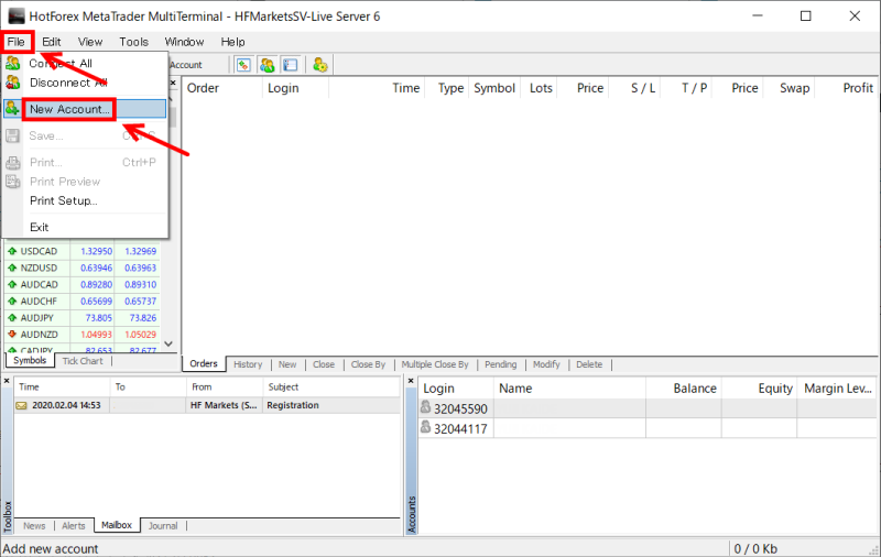 HFMの口座開設時に来る「HFM Live Account Opened」(もしくはHotforex Live Account Opened)というメールにMT4のログインID、パスワード、サーバー名が記載されています。