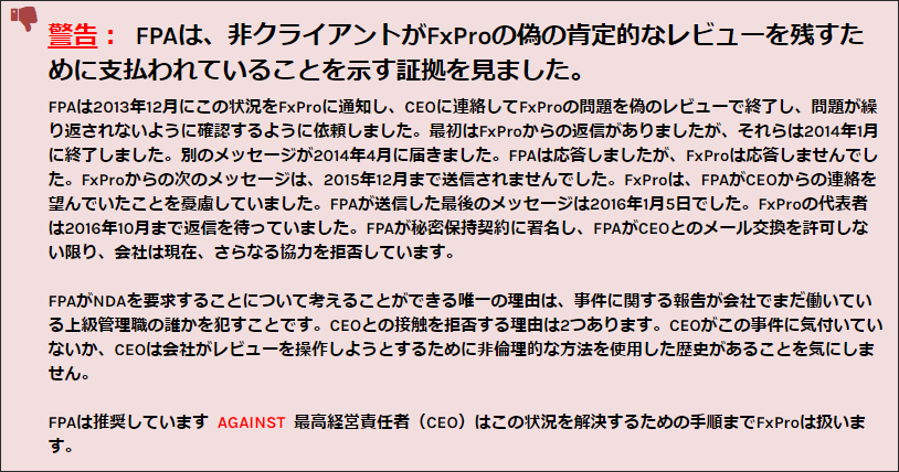 FxProはお金を払って嘘の評判をFPAに書き込みしていました。