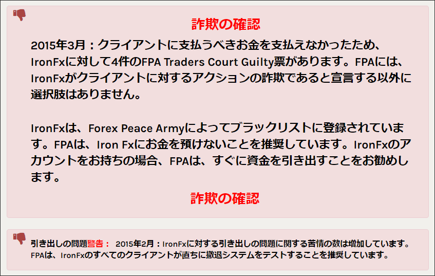 IronFxは悪名高い海外FX業者で知られていますが、FPAでは詐欺(=SCAM)扱いされていますね。
