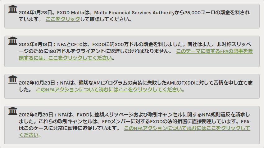 2013年はFXDDが不利なスリッページを意図的に行ったとしてNFA(全米先物協会)とCFTC(米国商品先物取引委員会)から約200万ドルの罰金を科せられています。