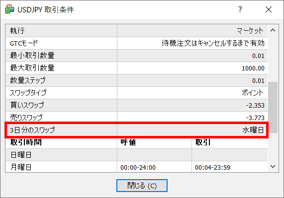 IC Marketsのスワップポイントは土日は付かず、水曜日(日本時間:木曜日の朝)が3倍付きます。