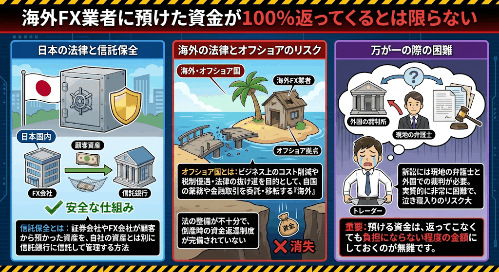 海外では投資に関する法律が日本と違い、信託保全(倒産時の資金保証)やルールは海外の国の法律が適用されます。