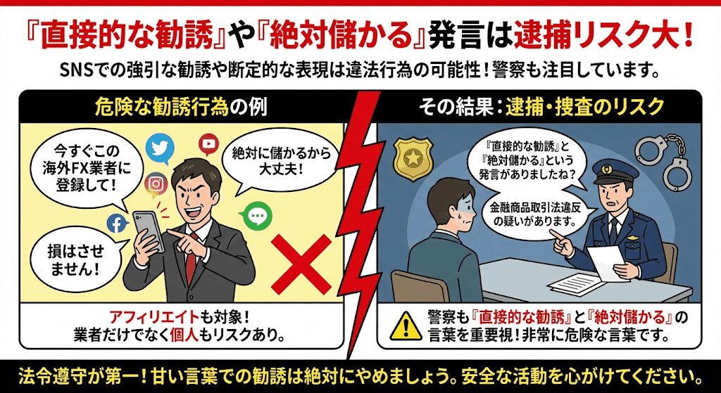 SNSなどを使って、直接的に海外FX業者に登録させようとする勧誘行為は違法であり、捕まるリスクが非常に高いです。