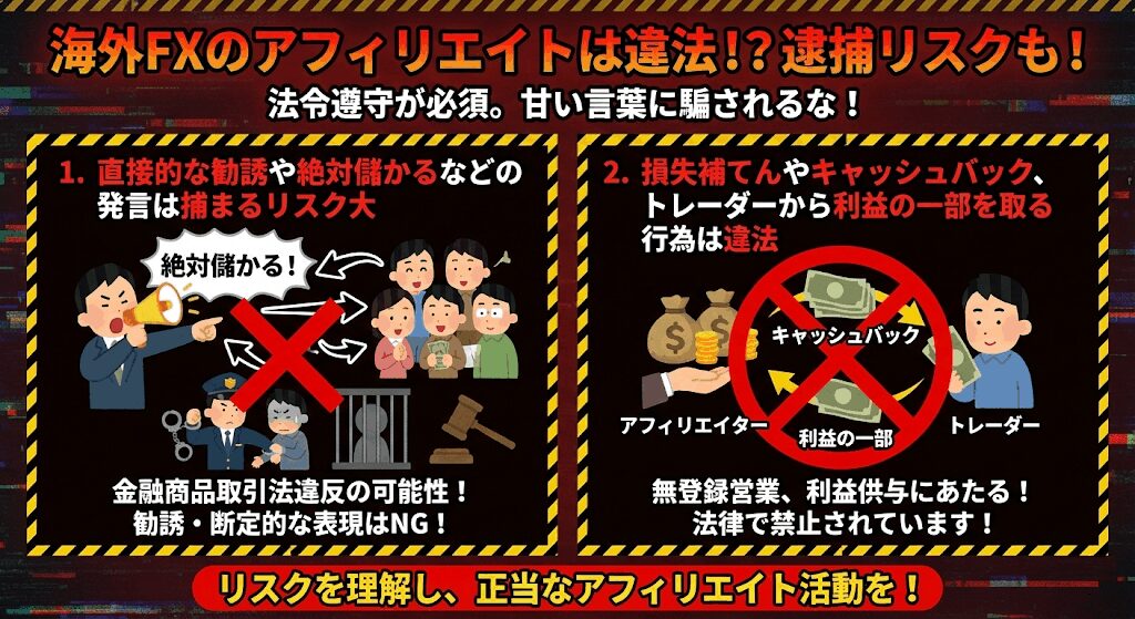 (海外FX業者は明確に違法、アフィリエイトも解釈によっては違法となりますが)