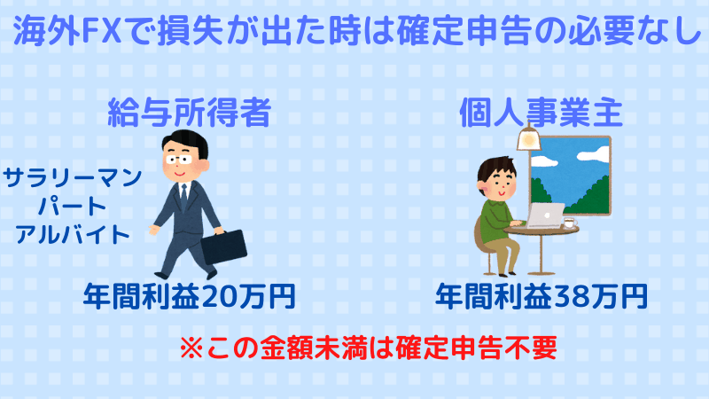 - 海外FXの年間の損益がマイナスの場合は確定申告の必要がなく、サラリーマンは年間利益20万円を超えると確定申告が必要になります。個人事業主は38万円から確定申告が必要です。