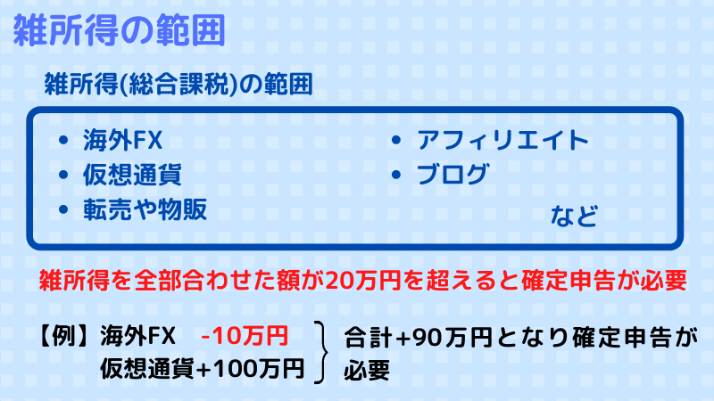 画像のように海外FXが年間-10万円でも、仮想通貨取引で年間+100万円の場合、合計すると+90万円となって確定申告が必要となります。