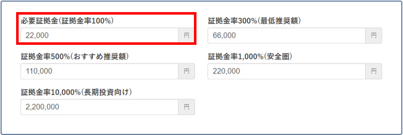 110円 × 10万通貨 ÷ 500倍 = 22,000円