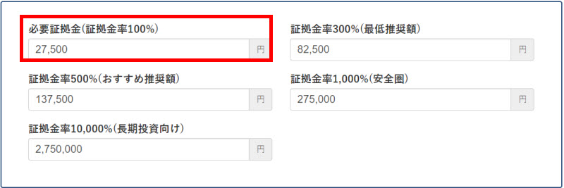110円 × 10万通貨 ÷ 400倍 = 27,500円