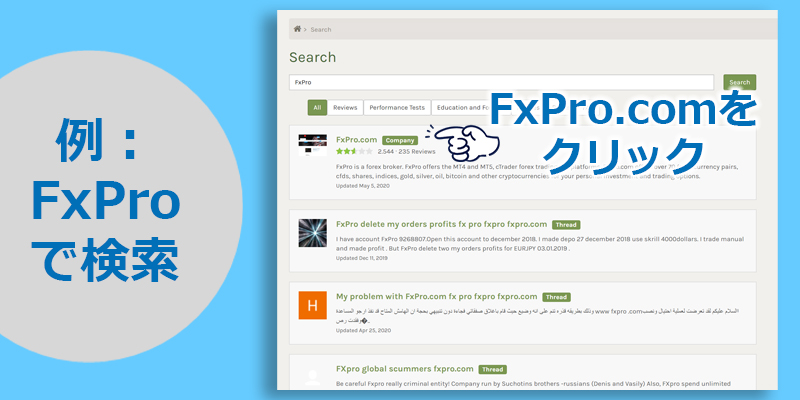 この検索ボックスに、調べたいFX業者の名前を入力しましょう。今回は、FxProで検索してみましょう。