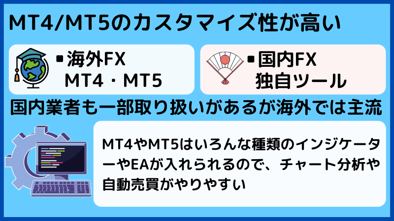 MT4/MT5はカスタマイズ性が高く、様々なインジケーターや自動売買EAを搭載することが出来ます。