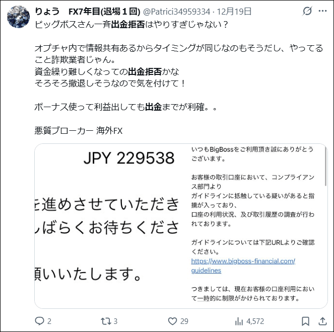 最終的にどうなったか分かりませんが、非常に多くの出金トラブルの投稿がありましたので気を付けてください。