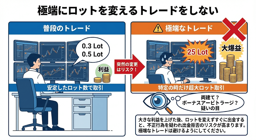 - 不正取引と疑われないように極端なトレードやロットを大きく変えるトレードを避けましょう。