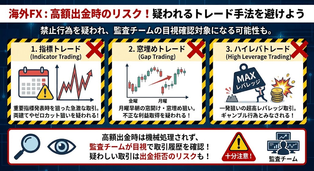 その他、指標発表時を狙ったトレードや月曜早朝時の窓埋めトレード、どこかのタイミングを狙ったハイレバトレードをすると禁止行為を疑われる可能性があるので注意しましょう。