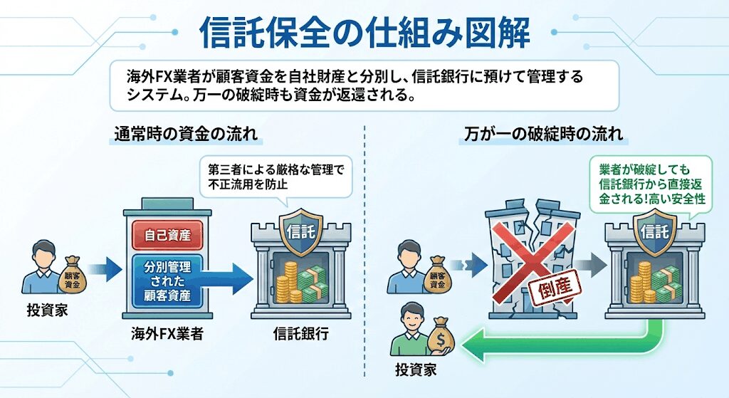 「海外FX業者が、顧客から預かった資金を業者自身の財産とは明確に区別したうえで、これを信託銀行に信託し、万が一業者が破綻した場合も、当該信託財産の範囲で投資家に返金される資金管理システム」