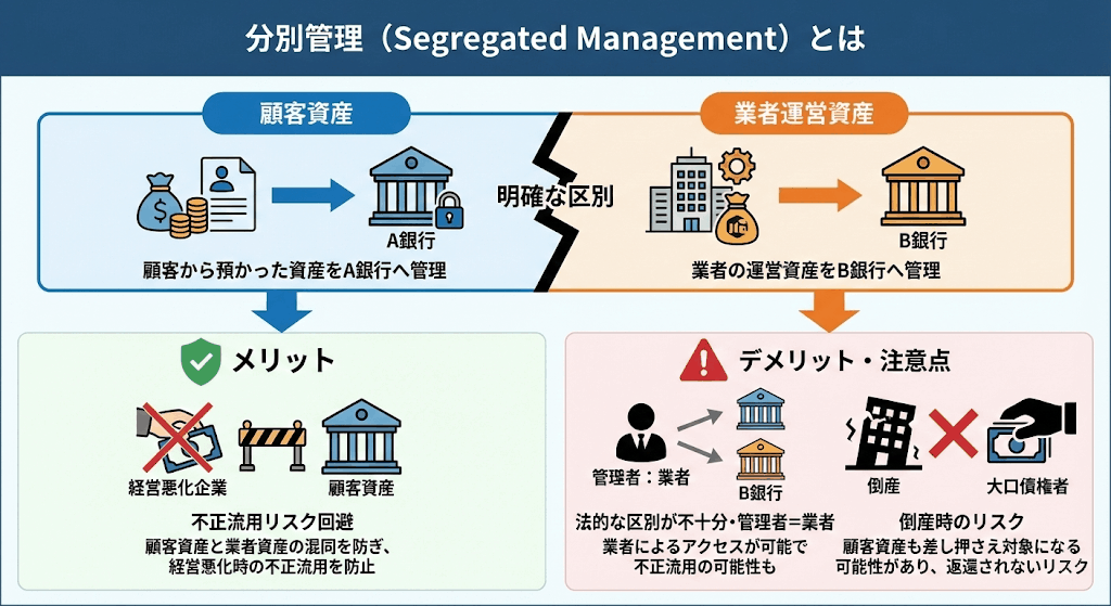 ただ、分別管理は顧客資産と業者資産が法的に区別されていませんし、いずれの管理者も業者になるため、業者による不正流用の可能性は否定できませんし、業者が倒産した際には顧客資産についても大口債権者から差し押さえられてしまう(顧客へ資金が返還されない)というデメリットを含んでいます。