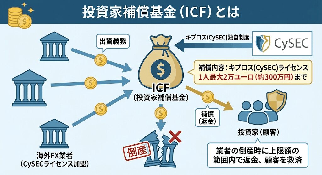 投資家補償基金(ICF)に加盟する海外FX業者が出資して、倒産した業者が出た場合に補償する制度(キプロス独自)
