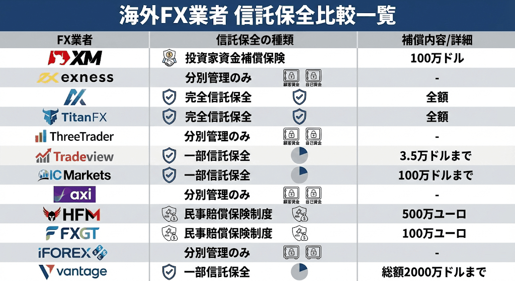 海外FX業者の信託保全一覧