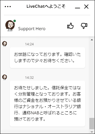 Vantageでは信託保全制度があり、コモンウェルス銀行というオーストラリアの銀行で会社全体で2,000万ドルの補填がされるように契約しています。