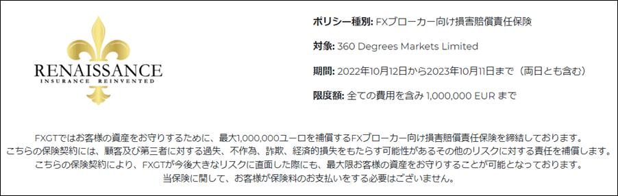 FXGTは分別管理の他に1人100万ユーロの損害賠償保険に加入しています。