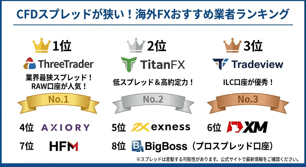 海外FXでCFDスプレッドが狭い業者をランキング形式で紹介していきます。