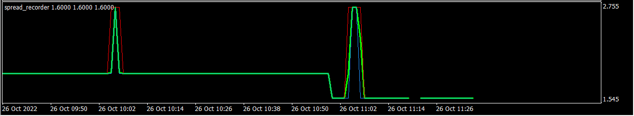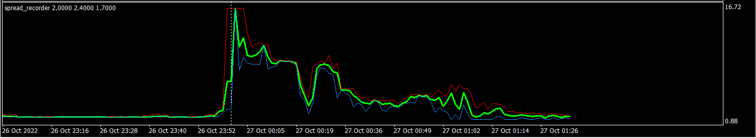 FxProのスプレッドを計測すると、このようにスプレッドが定期的にスプレッドが変動し、一時的に広くなることもあります。