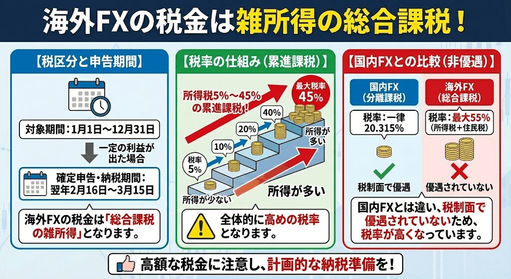 海外FXは「雑所得の累進課税」になるため、稼げば稼ぐほど税率が高くなります。