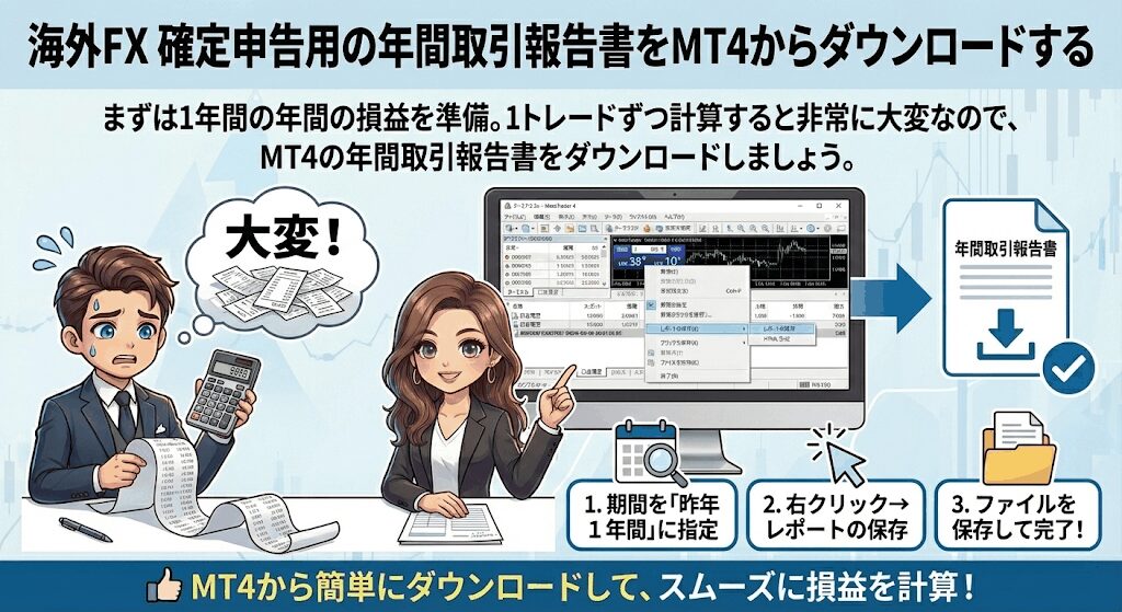 MT4の年間取引報告書のダウンロード方法を紹介します。