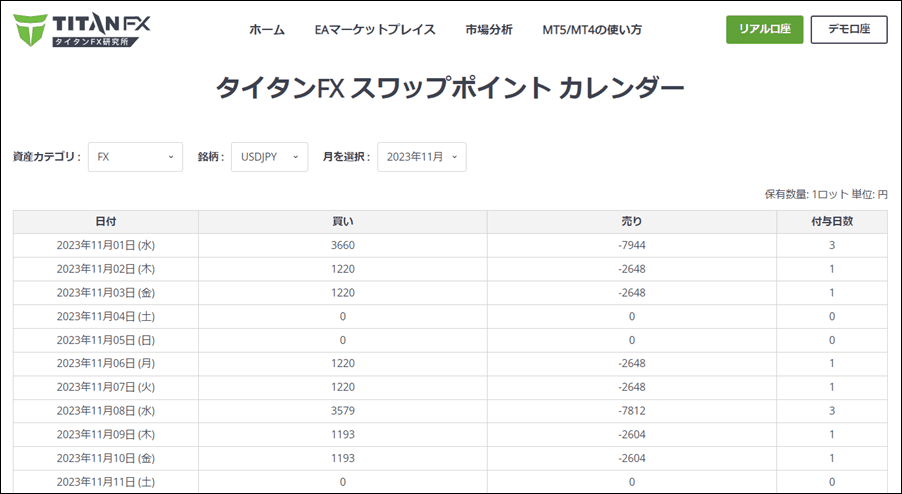 TitanFXのスワップポイント カレンダーを見るとスワップポイントを確認することができます。