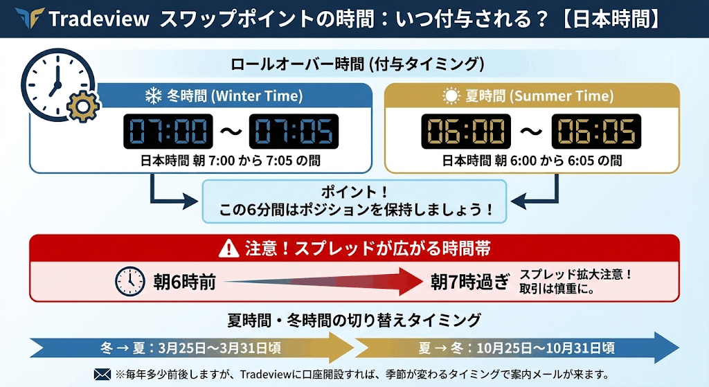 Tradeviewのスワップポイントが付与されるタイミングは朝方の「ロールオーバー」時間となります。