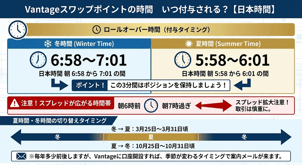 Vantageのスワップポイントが付与されるタイミングは朝方の「ロールオーバー」時間となります。