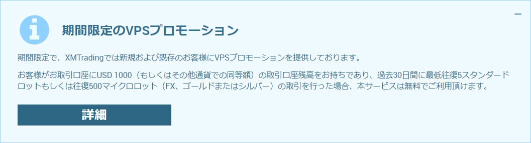 XMは1,000ドルの口座残高と毎月5ロット以上の取引が条件を満たすと無料でVPSが使えます。