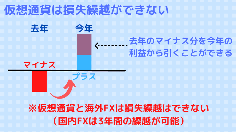 個人の場合、仮想通貨や海外FXで翌年以降に損失を繰り越すことはできないので注意が必要です。
